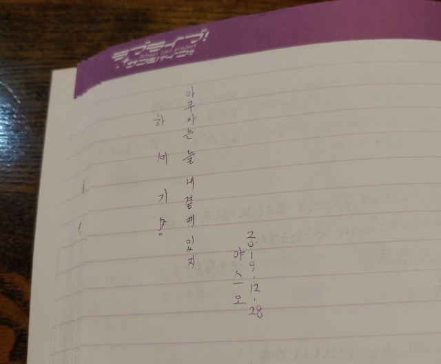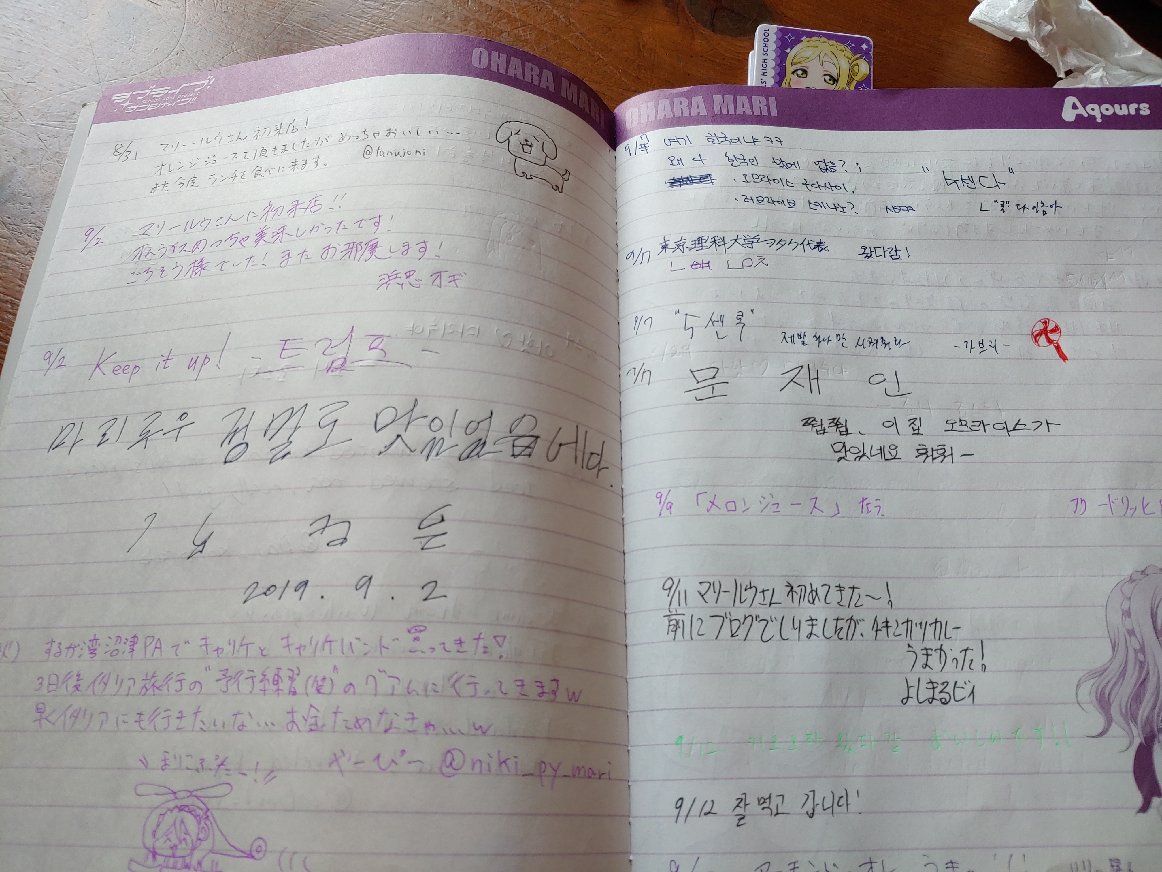 위에서도 얘기했지만 사장님의 '한국인 센서'가 동작하면 한국인(또는 러브라이브)라고 물어보시며, 바로 교류 노트, 즉 방명록을 가져다 주십니다. 내용은 흔한 성지순례 방명록과 비슷하게 능력자들의 그림, 성지순례에 대한 내용 등이 실려있지만, 워낙 한국인이 많이 찾다보니 물갤이나 검색하면 나오는 내용과 같이 재밌는 내용이 많습니다.
