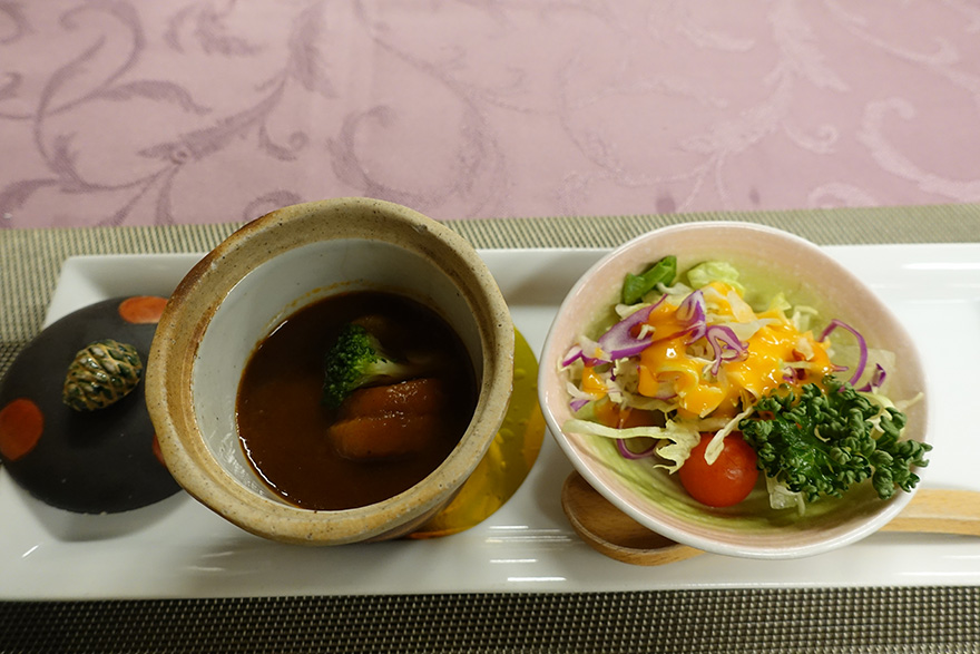 양식으로 비프 스튜와 샐러드가 나왔습니다. 드레싱은 역시나 감귤 드레싱. 양이 많지 않았지만 그럭저럭 괜찮았습니다. 먹다보니 왜 자꾸 아와시마 호텔(후기글 링크)이 생각나는걸까요.
