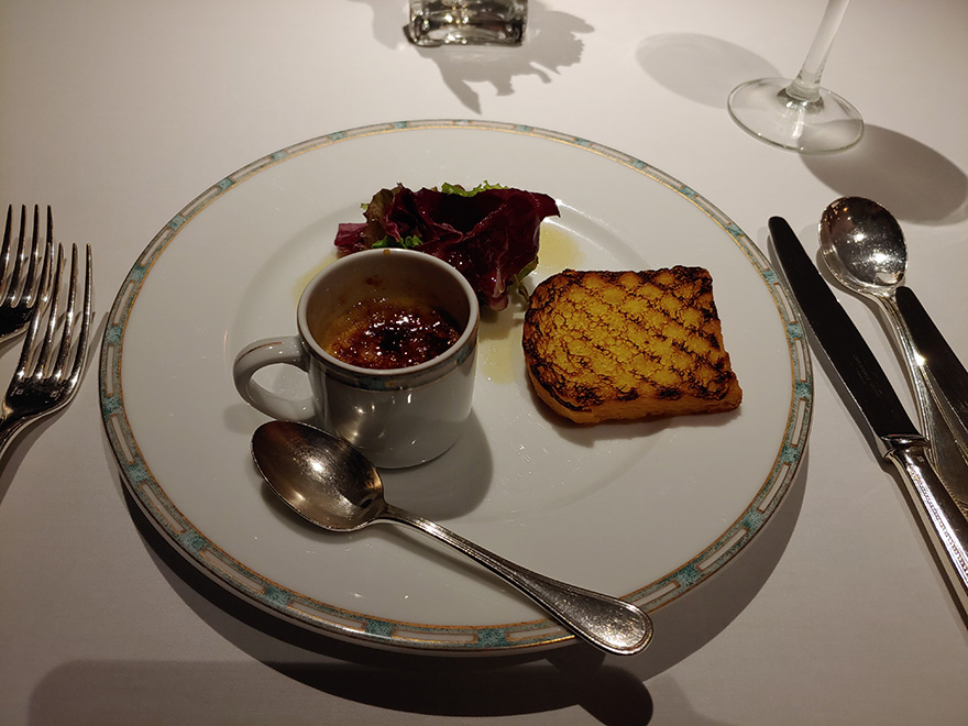 토스트와 '프레시 푸아그라가 들어간 크렘 브륄레'라는 게 나왔습니다. 뭐 쉽게 말하면 카라멜층이 있는 커스타드입니다. 둘 다 좀 그을린 것 같지만 맛은 있었습니다.